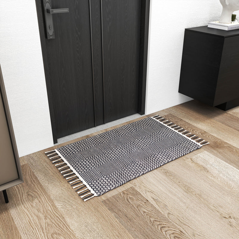 Farmhouse Cotton Rug, 2'x3' Black Handwoven Geometric Entryway Mat, Washable Kitchen Runner, Bathroom Carpet, Front Door Accent Rug Décor
