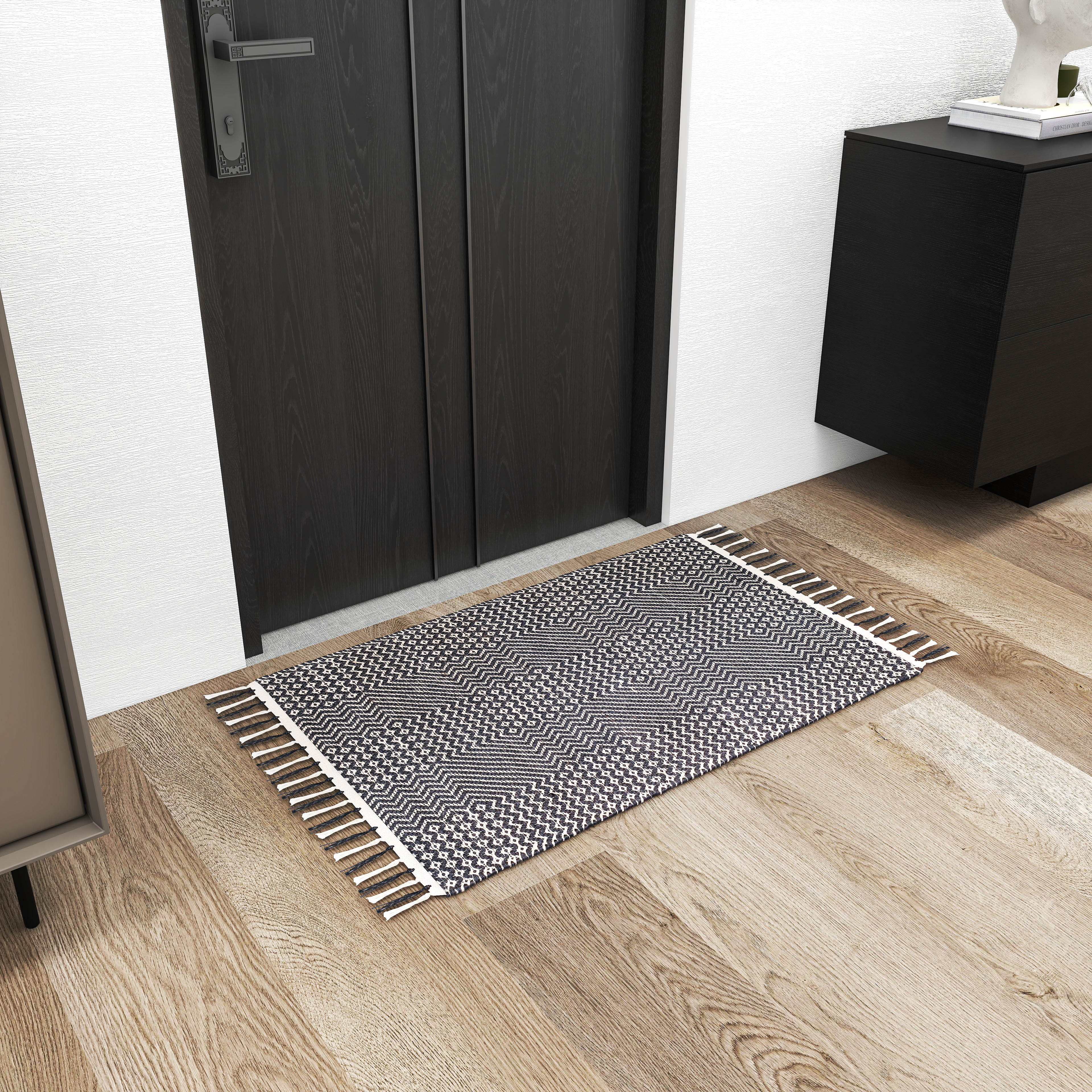 Farmhouse Cotton Rug, 2'x3' Black Handwoven Geometric Entryway Mat, Washable Kitchen Runner, Bathroom Carpet, Front Door Accent Rug Décor